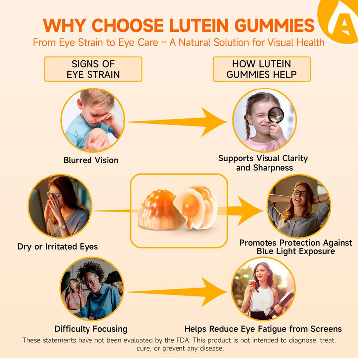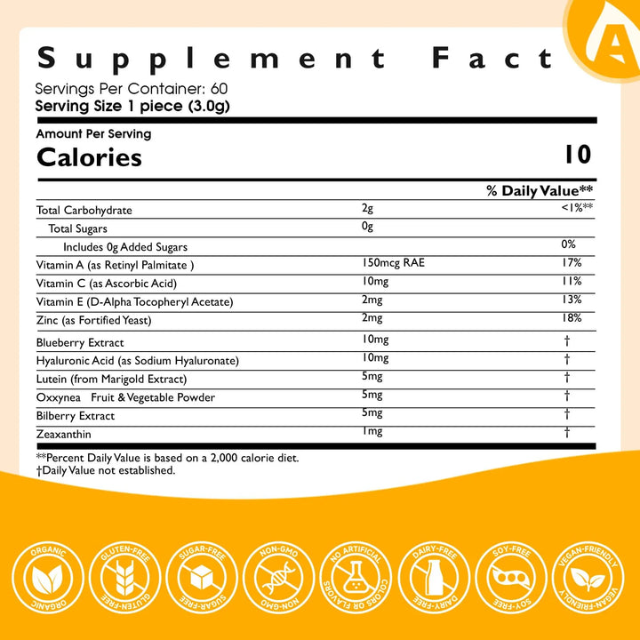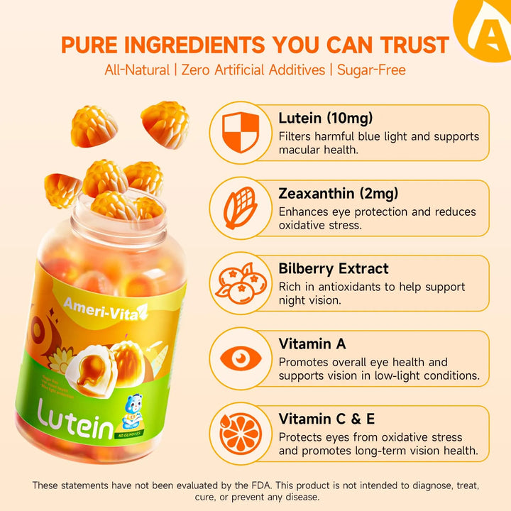 Gomitas de luteína: 5 mg de luteína y 1 mg de zeaxantina, arándano, arándano y ácido hialurónico, vitaminas para los ojos para niños y adolescentes, sin azúcar, sabor a naranja, 60 gomitas
