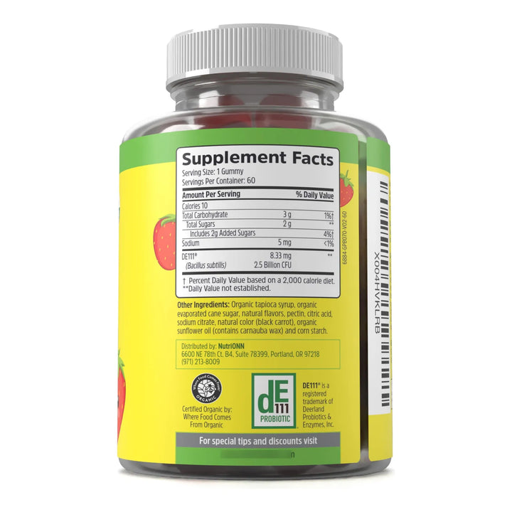 Estas gomitas están formuladas con ingredientes orgánicos y veganos, libres de OMG, para garantizar que tus hijos reciban solo lo mejor. Con un delicioso sabor a fresa, se convierten en un momento de alegría y cuidado diario. Cada gomita contiene 2.5 mil millones de UFC del probiótico DE111, una cepa única que apoya la digestión, fortalece el sistema inmunológico y promueve un microbioma intestinal saludable. ¡Es como un abrazo para su barriguita!