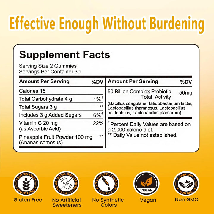 - 🍍 Sabor delicioso y fórmula limpia: Gomitas con sabor a piña, sin azúcares artificiales ni ingredientes dañinos. ¡Cuidarte nunca fue tan placentero!