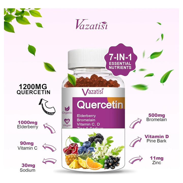 - Fórmula 7 en 1: Combina quercetina, saúco, bromelina, vitamina C, zinc, vitamina D y sodio para un apoyo inmunológico completo.