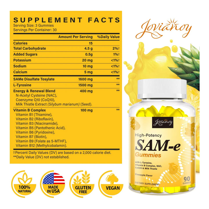 - Fórmula todo-en-uno: SAM-e, L-tirosina, vitaminas B y antioxidantes en una sola gomita 😊