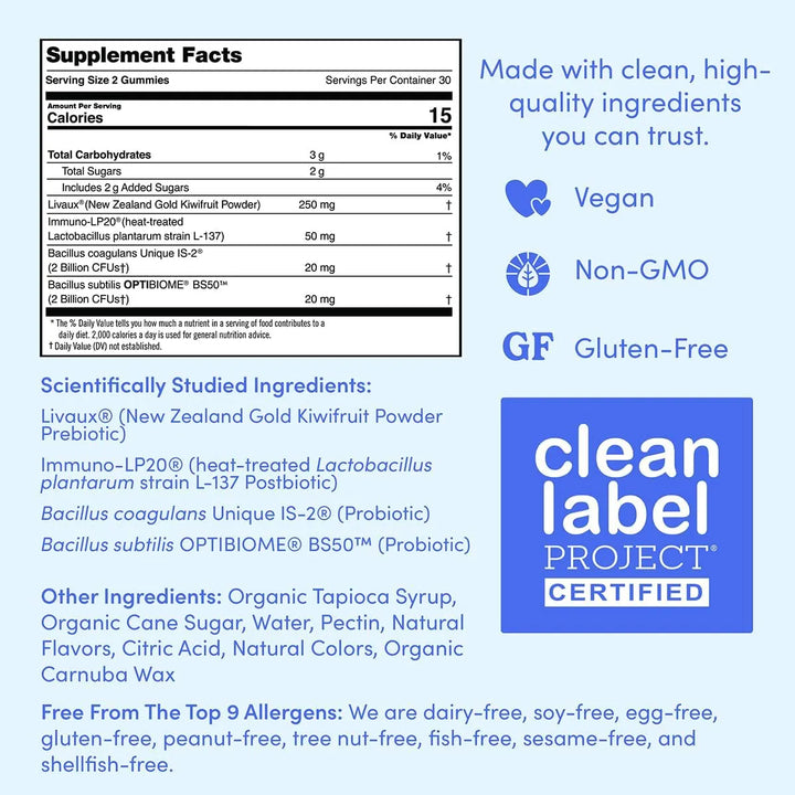 - Fórmula 3 en 1: Prebióticos, probióticos y postbióticos en una sola gomita. 🌟