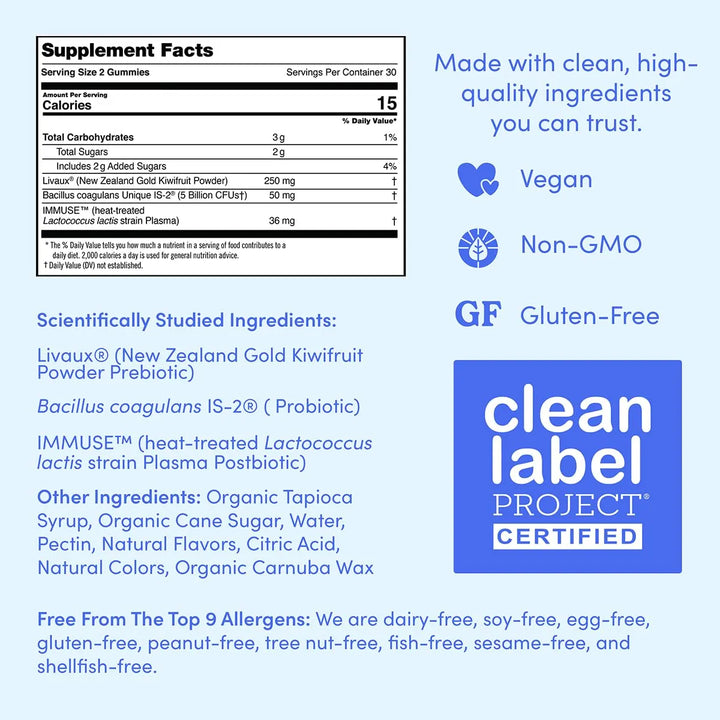 - Fórmula 3 en 1: Prebióticos, probióticos y postbióticos en una sola gomita. 🌟