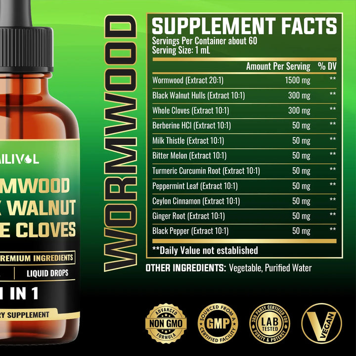 Las gotas trabajan en sinergia: el ajenjo y la nuez negra promueven la limpieza interna, mientras el clavo y la berberina apoyan la salud digestiva. La cúrcuma y el cardo mariano protegen tus células, creando un efecto integral. Para usarlo, agita el frasco antes de cada uso y toma la dosis recomendada (0.0 fl oz) directamente o diluida en líquido. Repite diariamente para óptimos resultados.