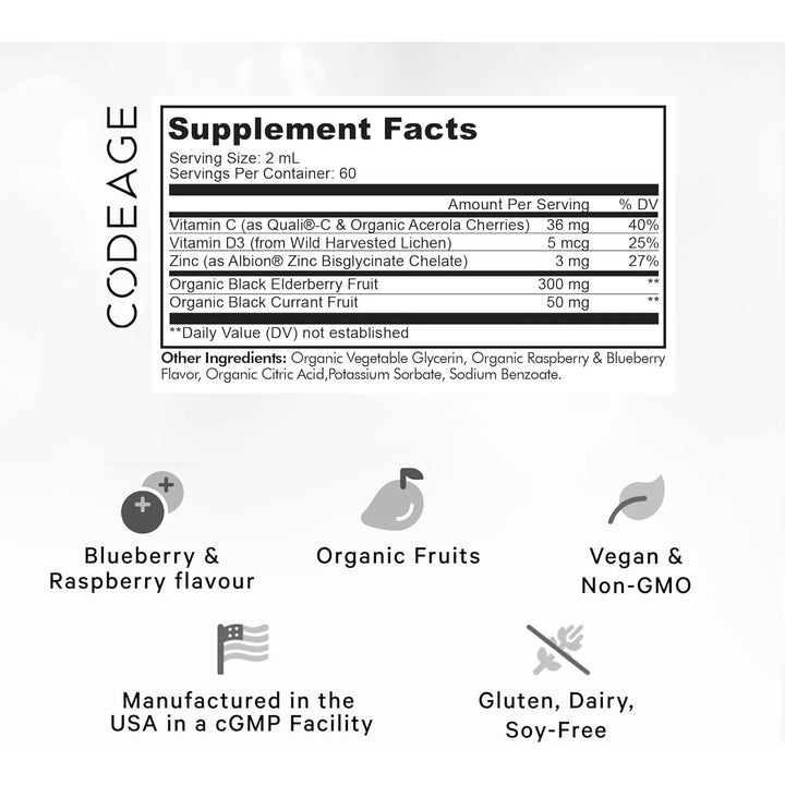 - Refuerza tu sistema inmunológico con una poderosa combinación de saúco negro orgánico, vitamina C, D3 y zinc.