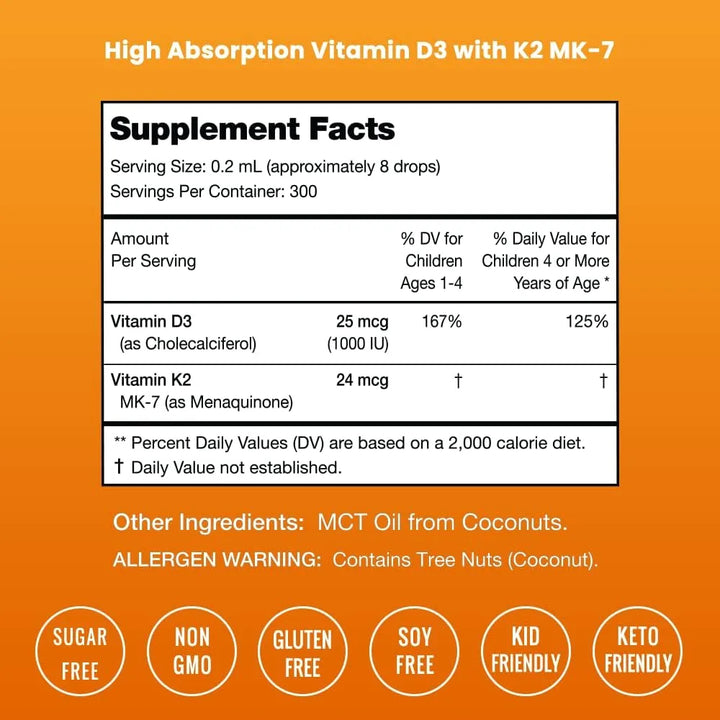La vitamina D3 y K2 trabajan juntas para fortalecer los huesos, apoyar el sistema inmunológico y promover un corazón saludable. Con solo 1000 UI por dosis, estas gotas son seguras, libres de azúcar y alérgenos, y fabricadas en Estados Unidos bajo los más altos estándares de calidad. ¡Dale a tus pequeños el mejor comienzo en la vida!