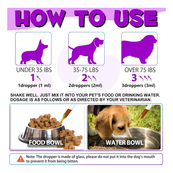 - Mide la dosis según el peso de tu perro: menos de 35 lbs (1 gotero), 35-75 lbs (2 goteros), más de 75 lbs (3 goteros).