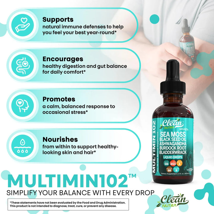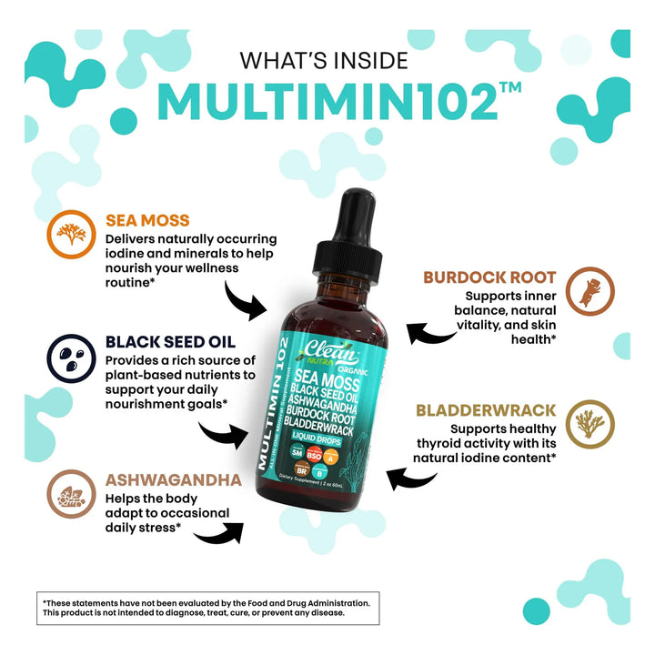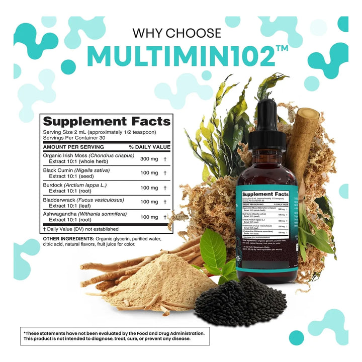 Las gotas de musgo marino actúan como un multivitamínico líquido, proporcionando minerales esenciales como yodo, zinc y magnesio que tu cuerpo absorbe rápidamente. El aceite de semilla negra y la ashwagandha trabajan juntos para reducir la inflamación y equilibrar tus niveles de energía, mientras que la raíz de bardana apoya la desintoxicación natural del organismo.