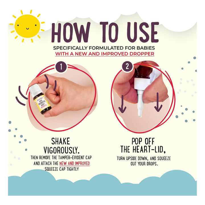 - Administra 5 gotas directamente en la boca del bebé o mezcla con leche materna/fórmula.