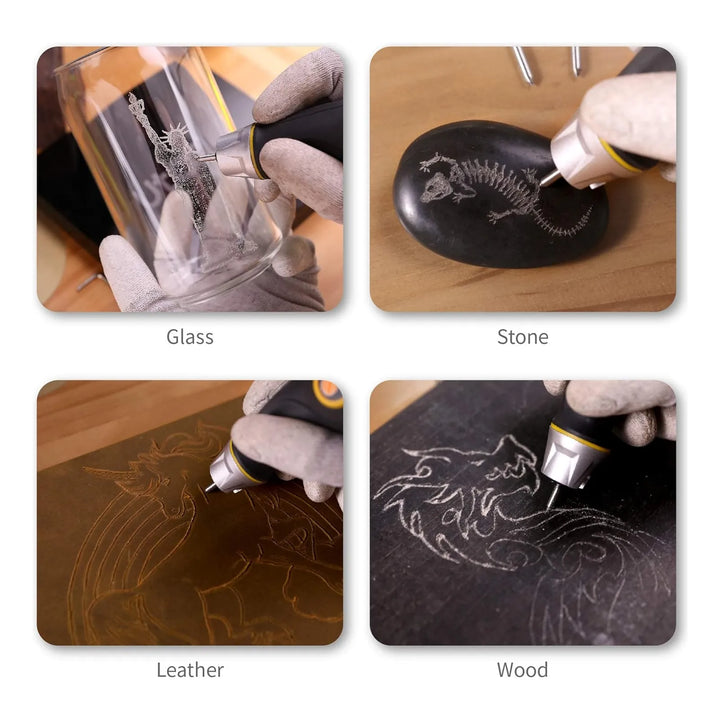 Con una potencia de 24W y 7200 golpes por minuto, este grabador ofrece un rendimiento excepcional. ¿Te preocupa la fatiga? Su mango recubierto de goma y diseño ergonómico garantizan horas de uso sin molestias. Además, las 4 puntas de carburo de tungsteno reemplazables te permiten adaptarte a cualquier proyecto, desde grabados delicados hasta trabajos más intensos. No importa si eres un aficionado o un profesional, este grabador está diseñado para superar tus expectativas.