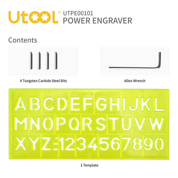 El grabador UTOOL utiliza un mecanismo de percusión de alta frecuencia (7200 golpes por minuto) para crear marcas limpias y precisas en diversas superficies. Su motor de 24W proporciona la fuerza necesaria para trabajar en materiales duros como metal o cristal, mientras que las puntas de carburo garantizan durabilidad y precisión. La plantilla incluida te ayuda a grabar letras y números con uniformidad, ideal para personalizar regalos o crear piezas únicas.