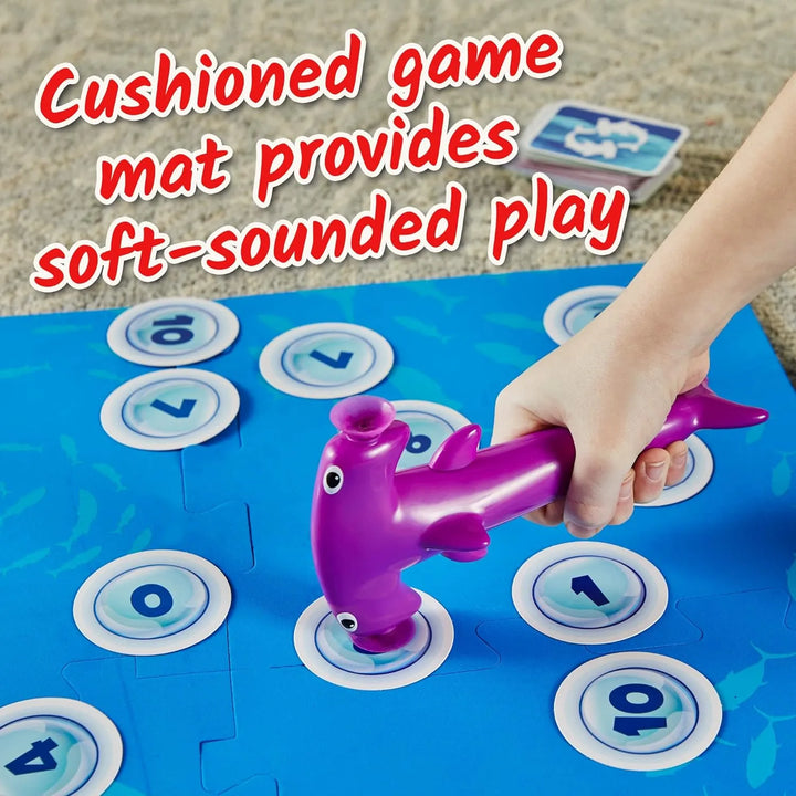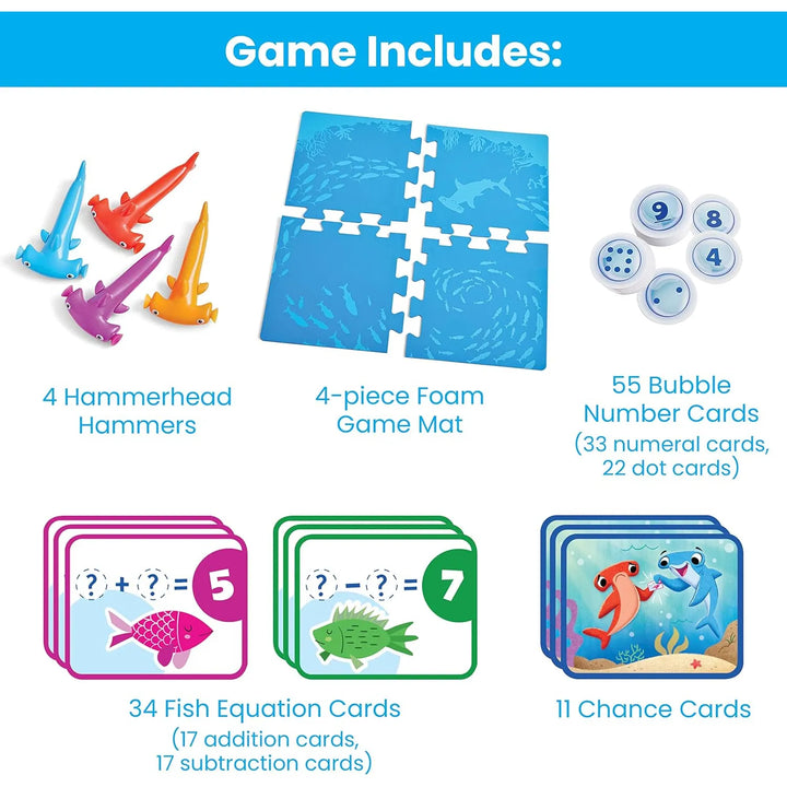El juego simula una emocionante cacería submarina donde los jugadores (2 a 4) compiten para resolver ecuaciones matemáticas. Cada jugador usa un martillo Hammerhead para recolectar tarjetas numéricas que coincidan con la ecuación que les tocó. ¡El primero en completarla correctamente gana la ronda! La alfombra suave evita ruidos molestos, y las cartas de oportunidad añaden un giro sorpresa. Con cada partida, los niños refuerzan su agilidad mental y disfrutan del proceso de aprendizaje.