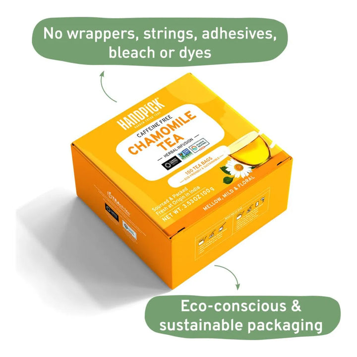 ¿Sabías que la manzanilla es conocida por sus propiedades relajantes? Nuestro té está verificado sin OGM y libre de cafeína, lo que lo hace perfecto para cualquier hora del día. Además, al elegir Handpick, estás apoyando prácticas sostenibles, ya que nuestras bolsas de té son ecológicas y libres de químicos dañinos. ¡Tu cuerpo y el planeta te lo agradecerán!