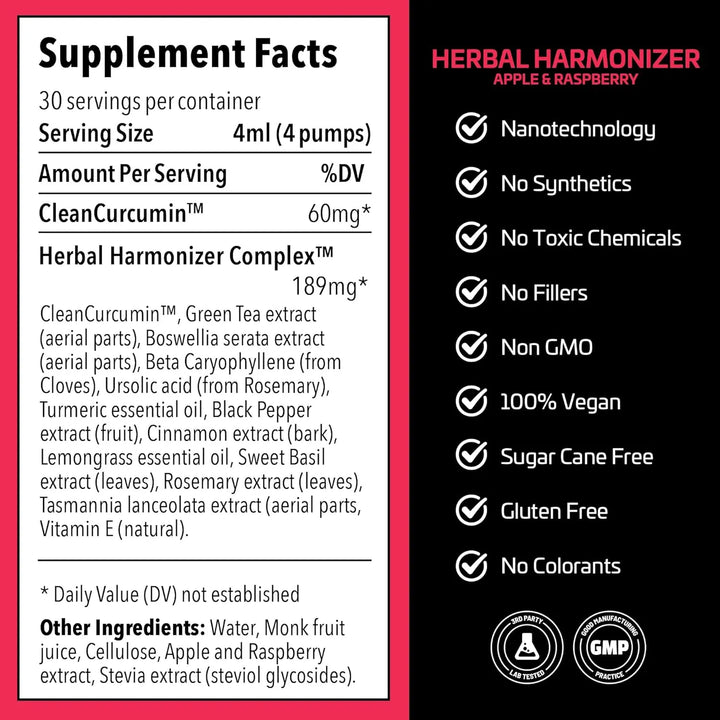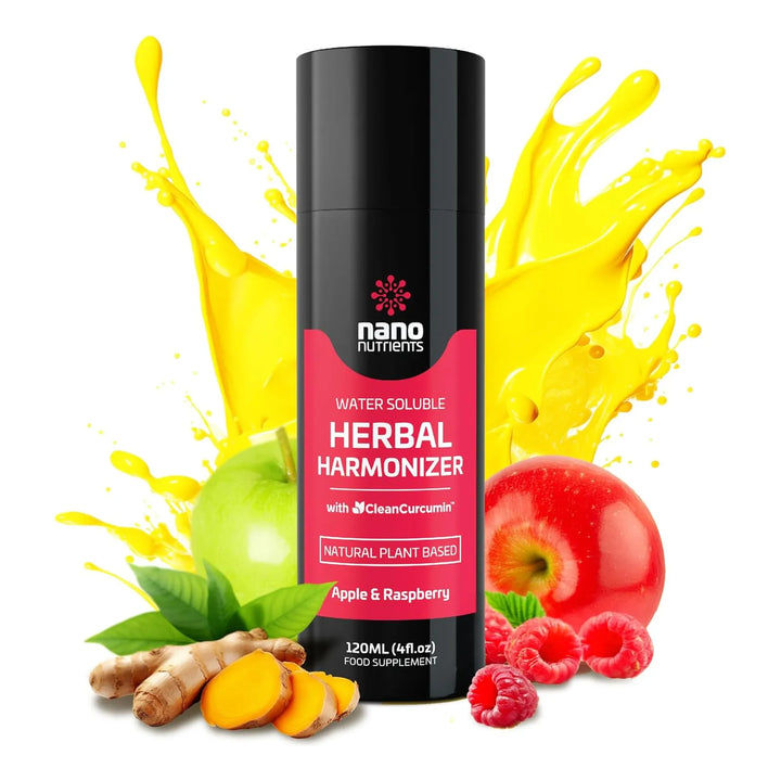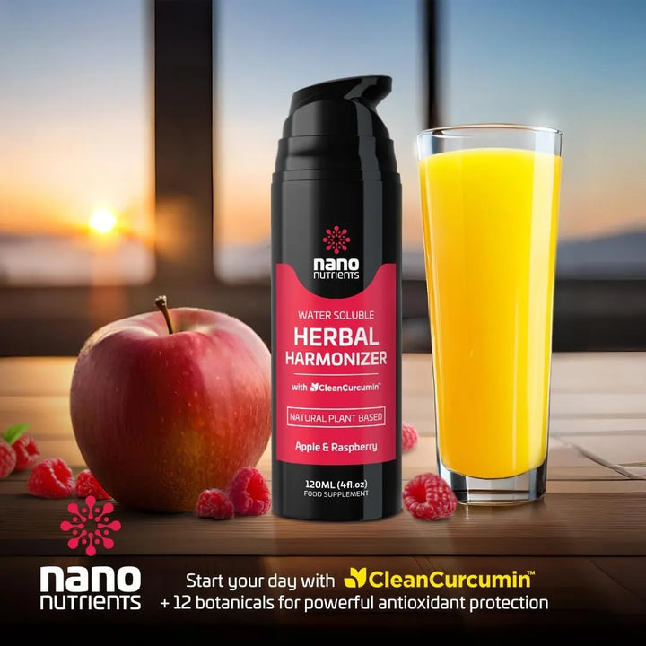 El Harmonizador Herbáreo Cleancurcumin utiliza una fórmula científicamente diseñada donde las nanopartículas de curcumina (CleanCurcumin™) se unen a extractos botánicos seleccionados. Estas partículas microscópicas atraviesan barreras celulares con facilidad, permitiendo que los antioxidantes actúen directamente en tus tejidos. El resultado: una protección profunda contra radicales libres, inflamación y estrés oxidativo, mientras apoyas la regeneración celular y el equilibrio interno.