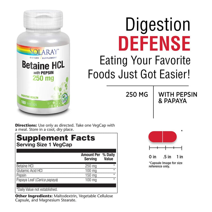 ¿Sientes pesadez después de comer? ¿Molestias estomacales que no te dejan disfrutar de tus comidas favoritas? El HCl con Pepsina de Solaray es tu solución. Diseñado para apoyar una digestión eficiente, este suplemento te ayuda a descomponer los alimentos de manera óptima, evitando esa sensación incómoda que arruina tu día.