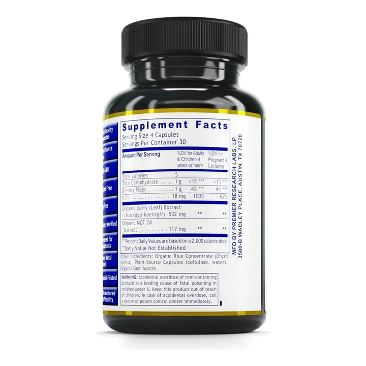 El hierro es un mineral esencial que tu cuerpo utiliza para producir hemoglobina, la proteína en los glóbulos rojos que transporta oxígeno. Nuestro suplemento proporciona hierro no hemo de origen vegetal que, combinado con el aceite MCT, se absorbe eficientemente en tu torrente sanguíneo. Las hojas de curry no solo aportan hierro, sino también compuestos naturales que apoyan la salud circulatoria.