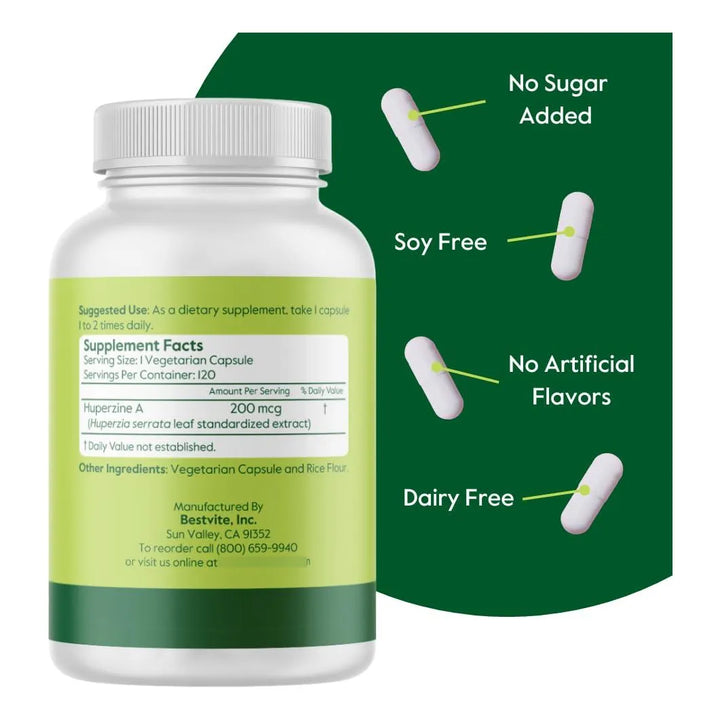 - Fórmula pura y potente: 200 mcg de Huperzina A por cápsula, derivada directamente de la planta. 🌿