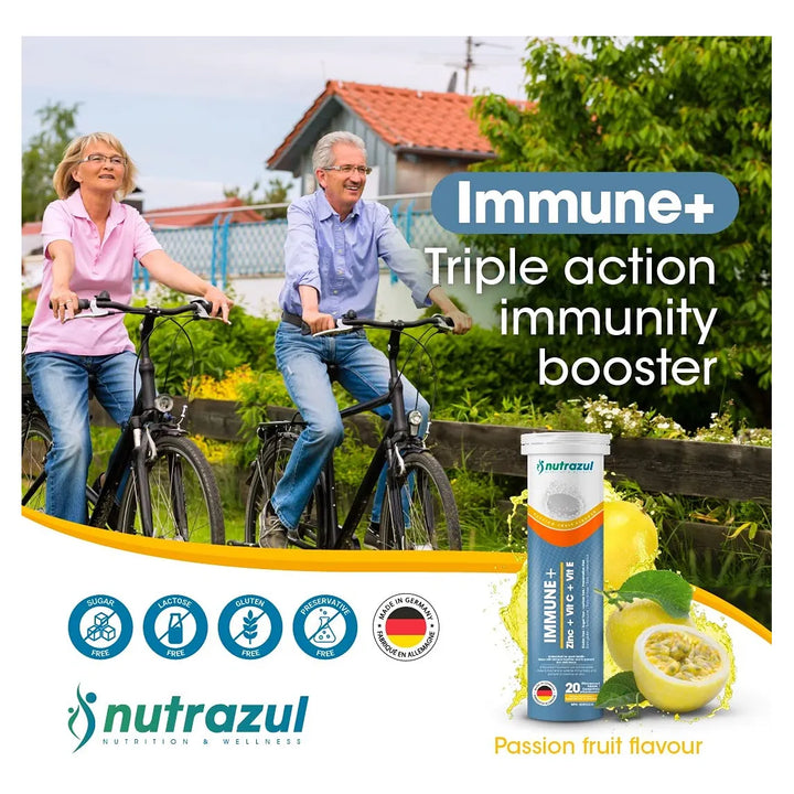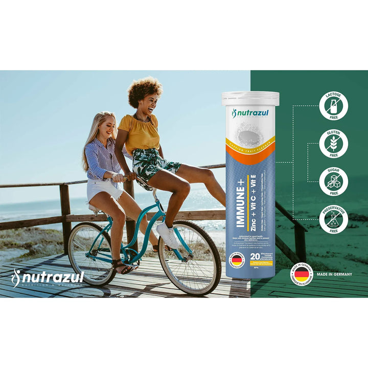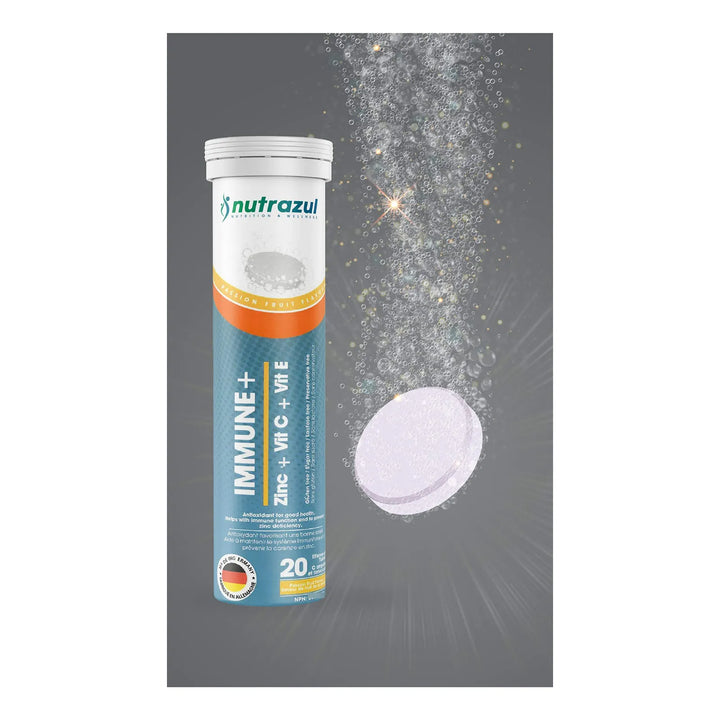 Immune+ está diseñado para disolverse rápidamente en agua, liberando sus nutrientes esenciales que son absorbidos por el cuerpo de manera eficiente. La vitamina C y el zinc trabajan juntos para fortalecer las defensas naturales, mientras que la vitamina E actúa como antioxidante, protegiendo las células. Este proceso ayuda a reducir el riesgo de infecciones y mejora la respuesta inmunológica.
