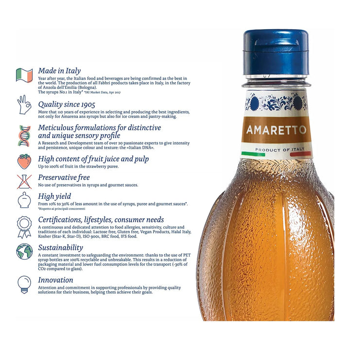 Imagina llevar la esencia de Italia directamente a tu cocina, cafetería o bar. El Aromatizante Amaretto Italiano Fabbri no es solo un jarabe, es una tradición de más de un siglo en cada botella. Desde 1915, la familia Fabbri ha perfeccionado este elixir con ingredientes premium, garantizando un sabor inigualable que transformará tus bebidas y postres en experiencias gourmet.