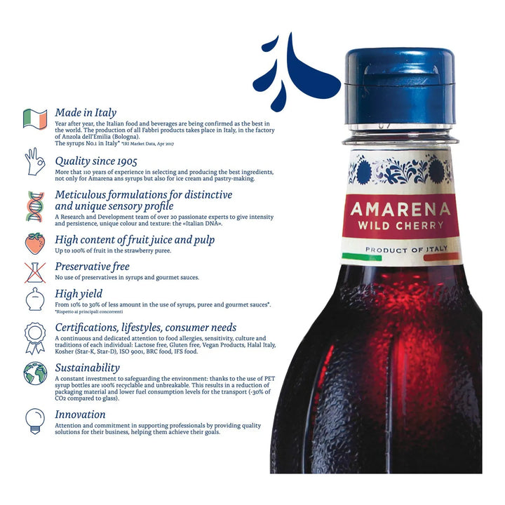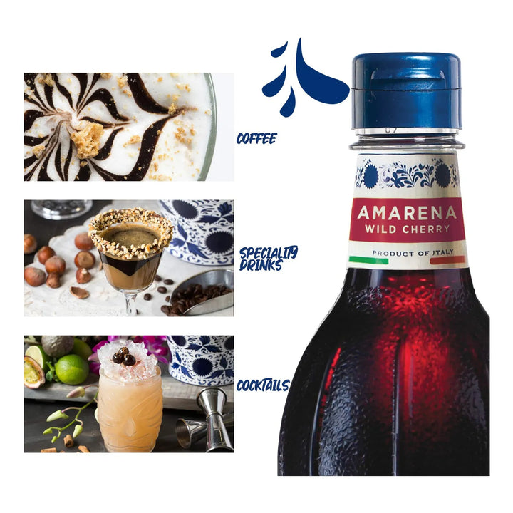 El secreto está en su fórmula artesanal: los jugos de cereza Amarena se mezclan con azúcares naturales en una proporción científica que realza el sabor sin saturar. Al diluirse, libera notas frutales y un acabado sedoso que armoniza con cualquier base. ¡Es como tener un chef italiano en tu despensa!