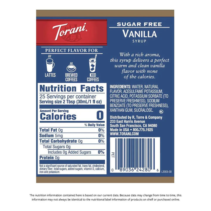 El Jarabe Torani Sin Azúcar está diseñado para disolverse fácilmente en bebidas frías o calientes, liberando un sabor intenso y equilibrado que realza cualquier preparación. Su fórmula con sucralosa garantiza un dulzor consistente sin alterar el sabor original de tus bebidas favoritas.