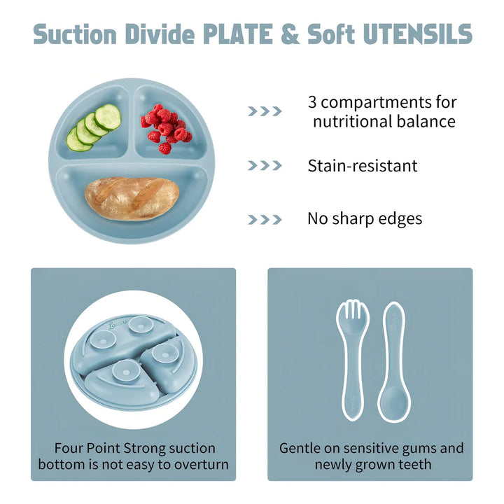 Este juego está diseñado para facilitar la transición de tu bebé hacia la alimentación independiente. Los utensilios flexibles y el plato de succión permiten que tu pequeño practique sin frustraciones, mientras el material seguro garantiza que cada experiencia sea libre de riesgos.