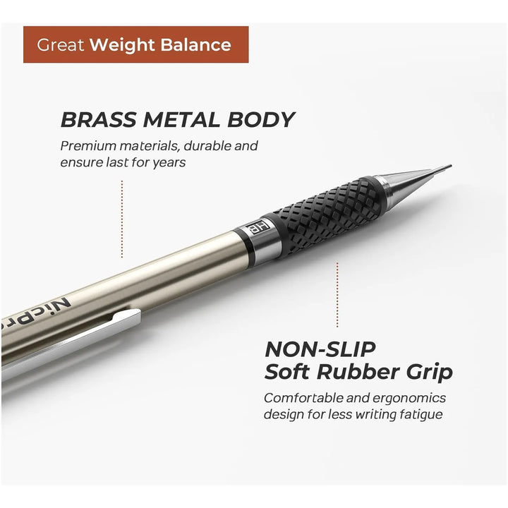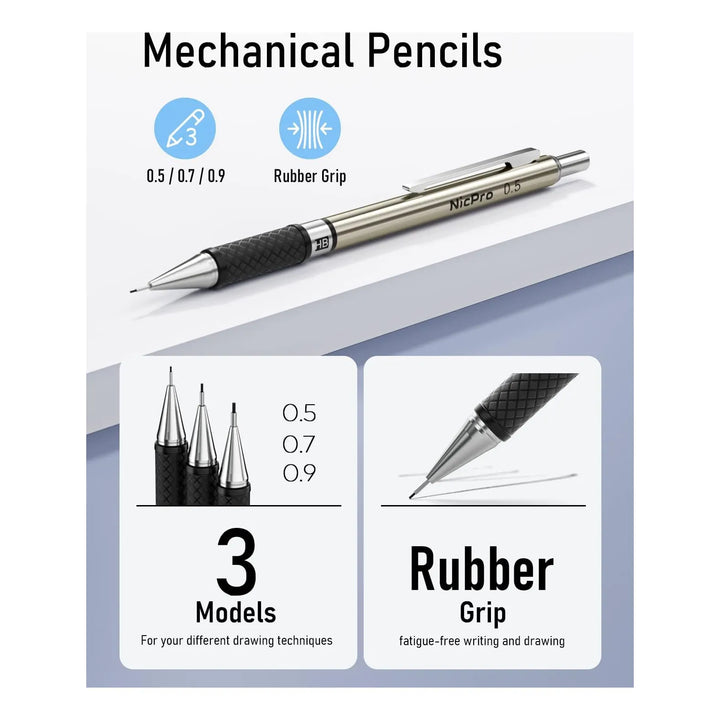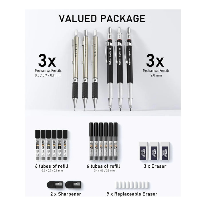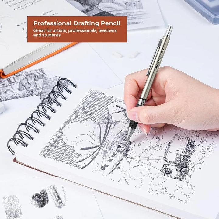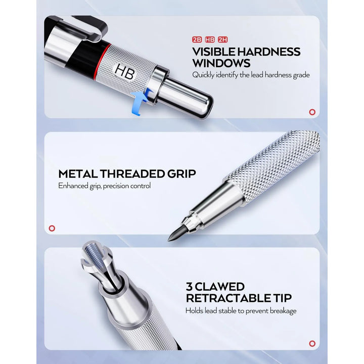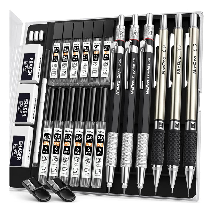 Este set no solo incluye 6 lápices con diferentes grosores de mina (0.020 in, 0.028 in, 0.035 in, y 0.079 pulgadas en 2B, HB, 2H), sino que también viene con 12 tubos de recambio, 3 gomas, 6 piezas de repuesto de borrador, y 2 sacapuntas de minas. Todo lo que necesitas para mantener tu arte fluyendo sin interrupciones. El agarre antideslizante te permite trabajar durante horas sin fatiga, mientras que el equilibrio de peso optimizado asegura que cada movimiento sea preciso y cómodo.