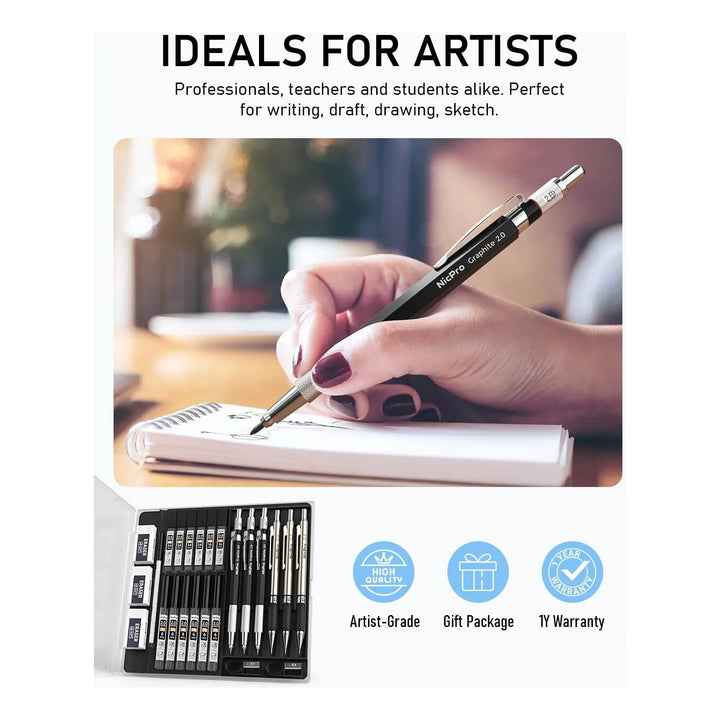 - 🎨 Precisión en cada trazo: Con minas de diferentes grosores y durezas, tendrás el control absoluto sobre tus creaciones, ya sea para detalles finos o sombreados intensos.