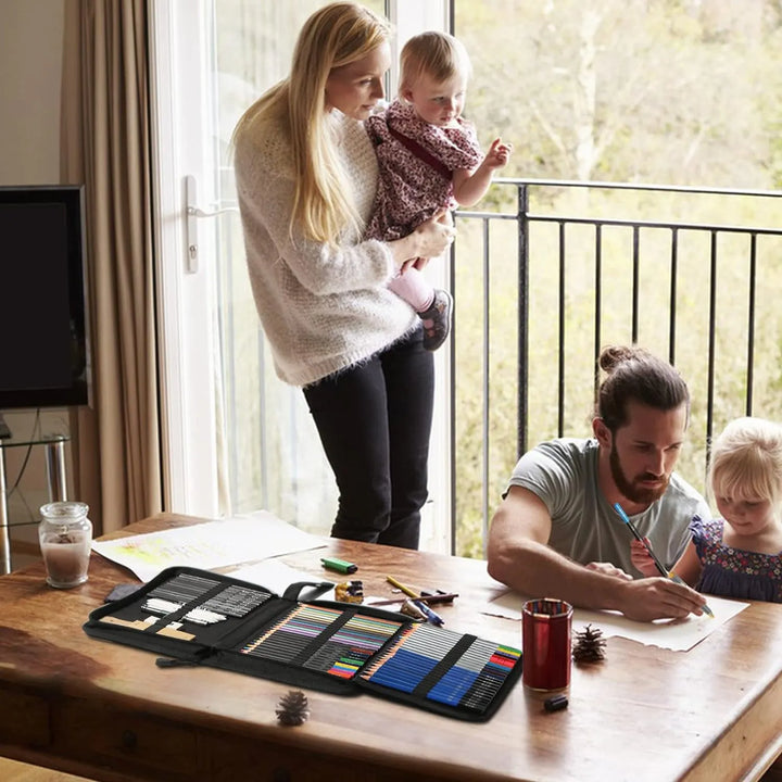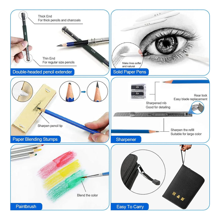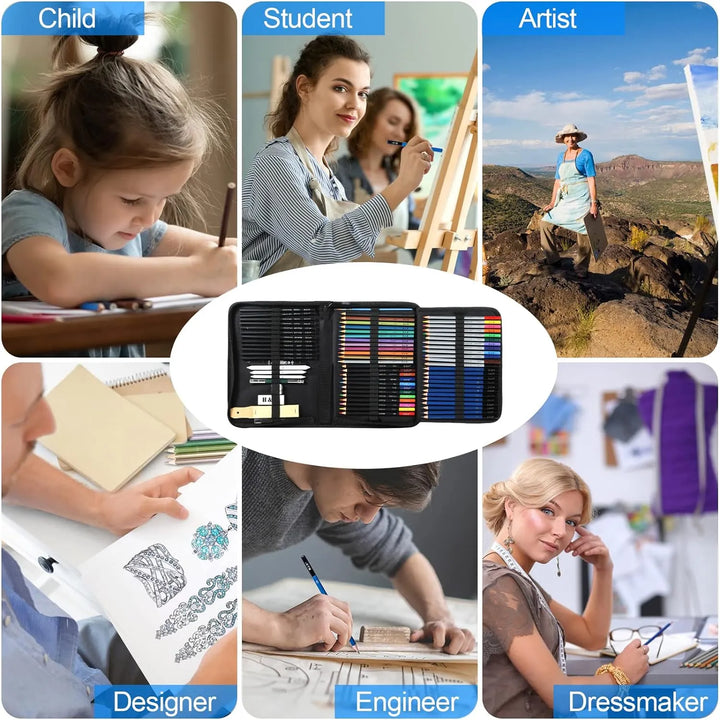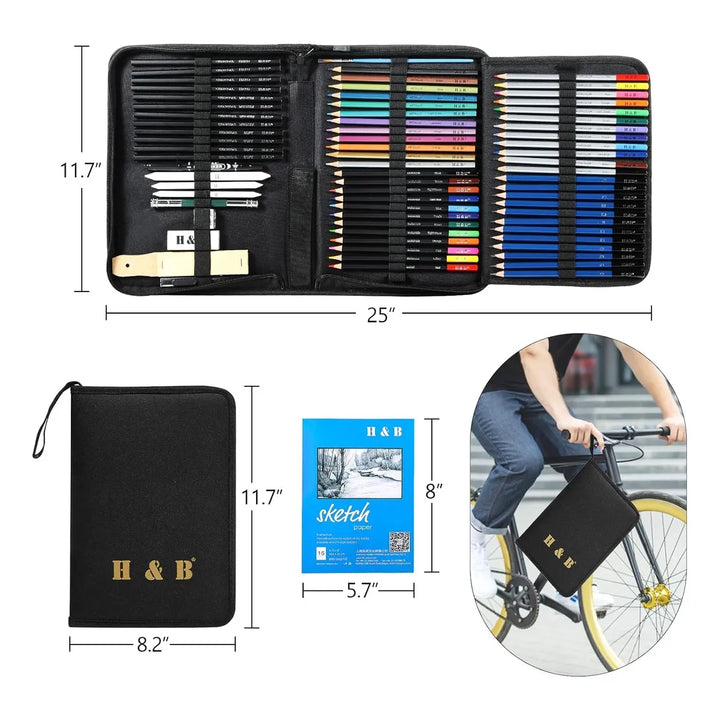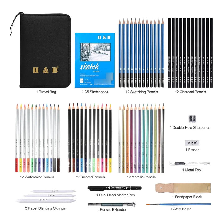 Imagina tener acceso a 12 lápices de acuarela, 12 lápices de colores a base de aceite, 12 lápices de bocetos, 12 lápices de colores metálicos y 12 lápices de carbón, todo en un solo estuche portátil. Ya sea que estés dibujando, pintando o haciendo bocetos, este kit versátil se adapta a todas tus necesidades creativas.