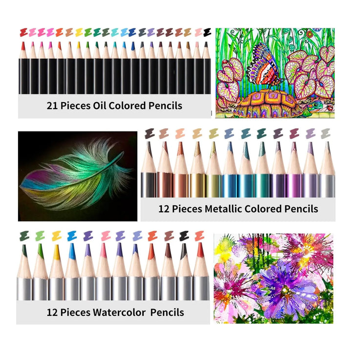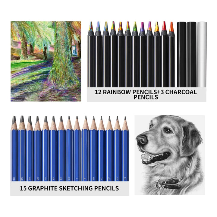 - ✨ Todo En Uno: Grafito, acuarela, metálicos y más, todo en un solo kit para explorar diferentes técnicas.