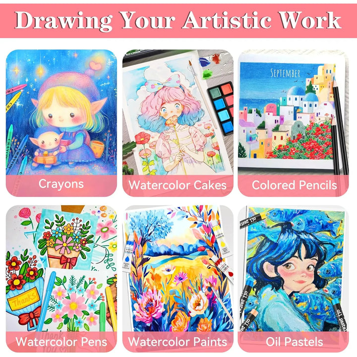 Este conjunto artístico funciona como tu estudio creativo portátil. La variedad de medios (acuarelas, crayones, lápices) te permite experimentar con diferentes estilos hasta encontrar tu voz única. Los pigmentos de alta calidad aseguran colores vibrantes que permanecen fieles a tu visión artística, mientras que los papeles incluidos están optimizados para cada técnica.
