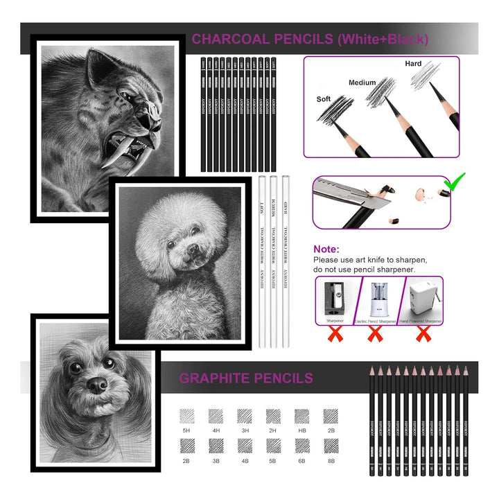Este juego de dibujo está diseñado para acompañarte en cada etapa de tu proceso creativo. Los lápices profesionales permiten sombrear y mezclar con facilidad, mientras que los papeles de diferentes tonos te ayudan a experimentar con contrastes y efectos únicos. Las herramientas adicionales, como los tocones de mezcla y los pinceles, garantizan que cada detalle de tu obra sea perfecto.
