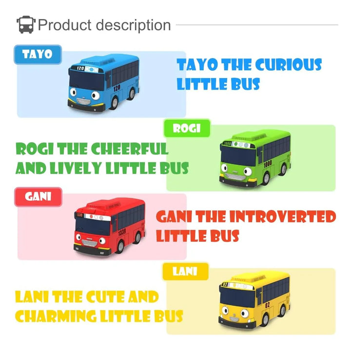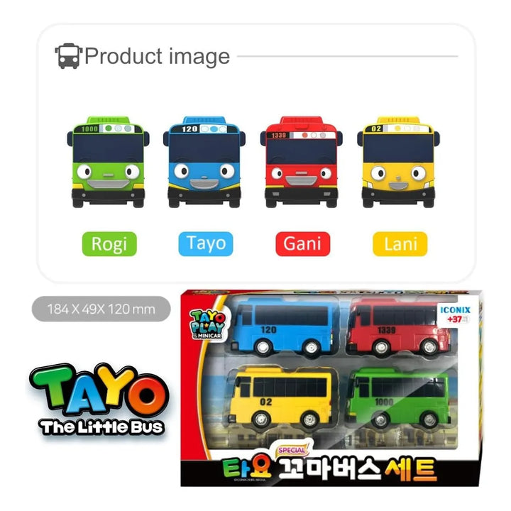 - Set de 4 autobuses: Incluye Tayo, Rogi, Gani y Rani, cada uno con detalles únicos. 🚍