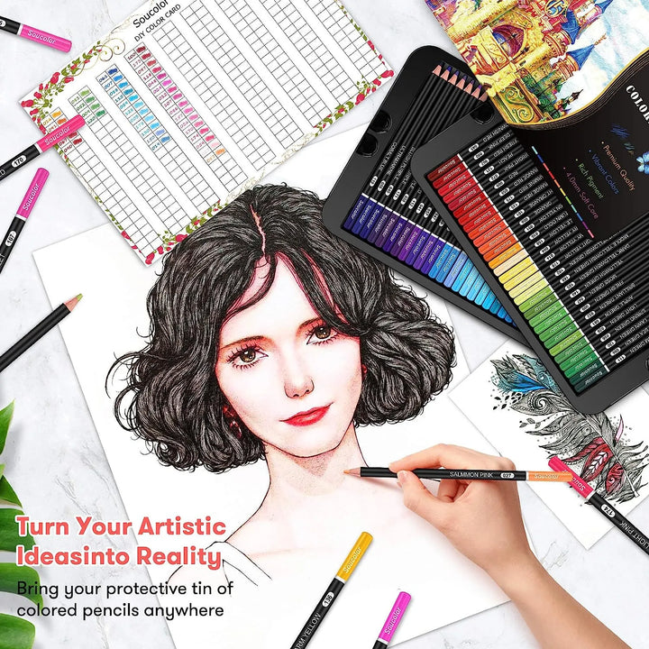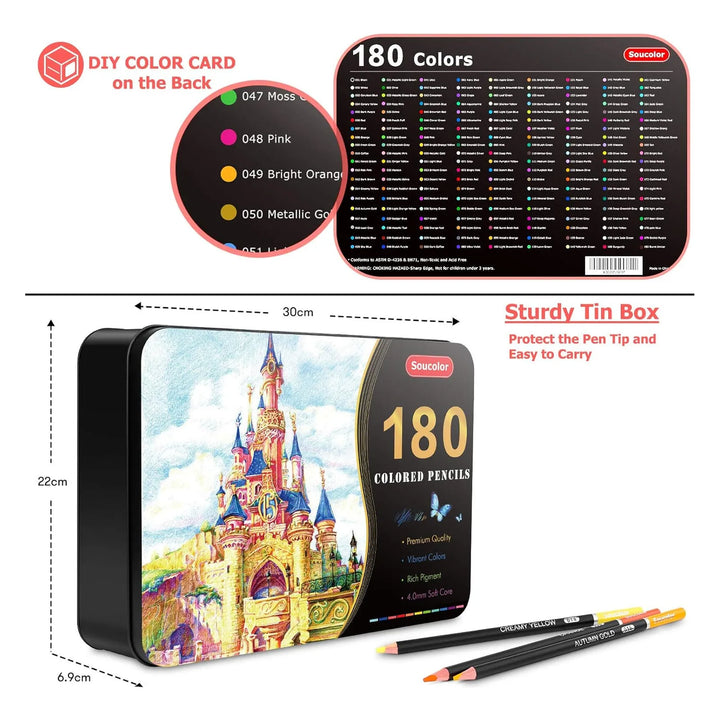 Los lápices de colores Soucolor están diseñados para ofrecerte una experiencia de dibujo sin igual. Su núcleo suave y resistente permite trazos fluidos y precisos, mientras que los 180 colores vibrantes te brindan la libertad de explorar tu creatividad sin límites. La caja de lata de metal no solo protege tus lápices, sino que también los mantiene organizados y listos para usar en cualquier momento.