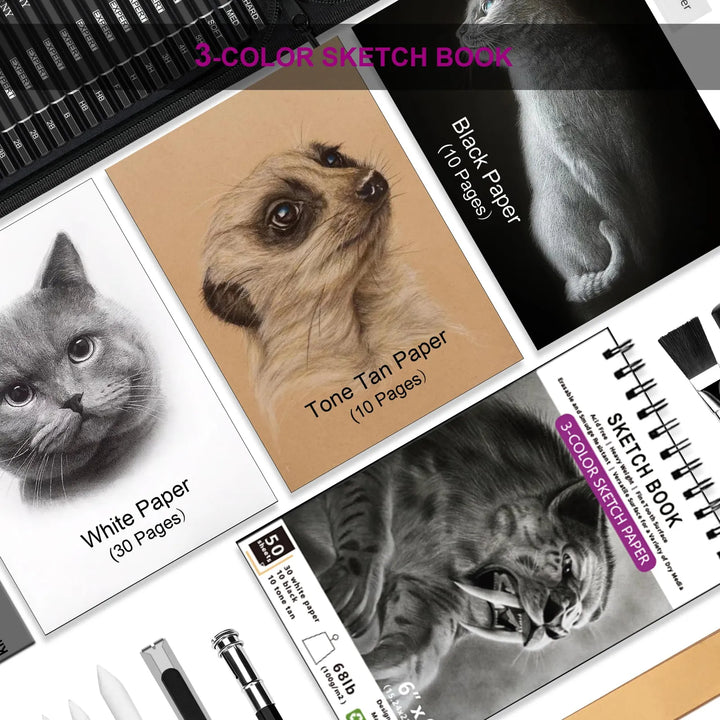 Este juego está diseñado para acompañarte en cada paso de tu proceso creativo. Los lápices de grafito y carbón permiten desde sombreados intensos hasta líneas finas, mientras que los accesorios como los tocones de mezcla y los borradores especializados te ayudan a perfeccionar los detalles. El cuaderno de bocetos, con sus páginas blancas, negras y beige, ofrece un lienzo versátil para cualquier técnica.