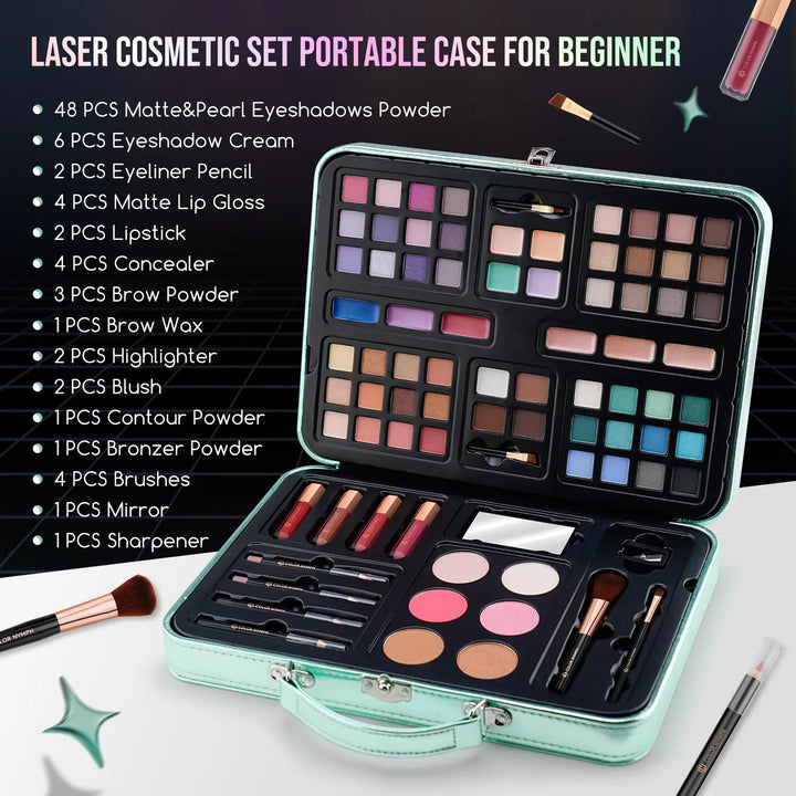Este no es solo un juego de maquillaje más. Es una experiencia completa que incluye todo lo que necesita para empezar: desde sombras de ojos en 54 colores vibrantes hasta brillos de labios que brillan como su personalidad. Cada componente ha sido seleccionado para garantizar diversión sin preocupaciones, gracias a su fórmula hipoalergénica y libre de parabenos. ¿Lo mejor? Viene en un estuche verde portátil, perfecto para llevar a fiestas, viajes o donde su imaginación la lleve.