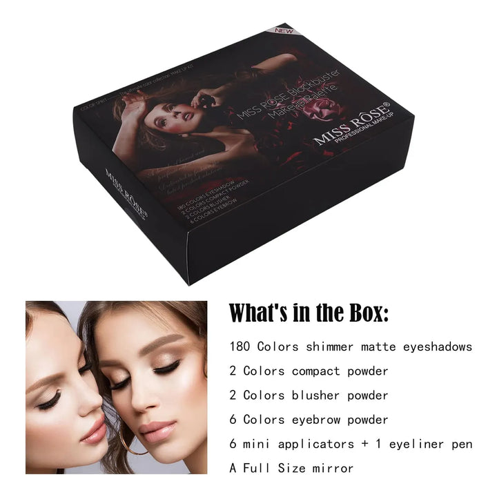 - 🎨 Variedad sin límites: 180 sombras de ojos + 2 polvos compactos + 2 coloretes + 6 polvos de cejas. ¡Crea infinitas combinaciones!