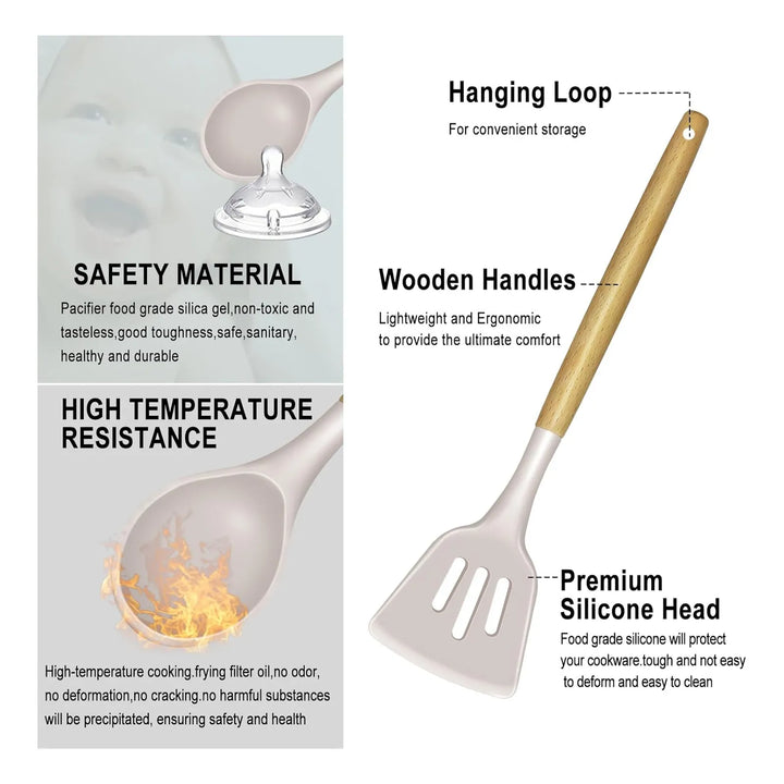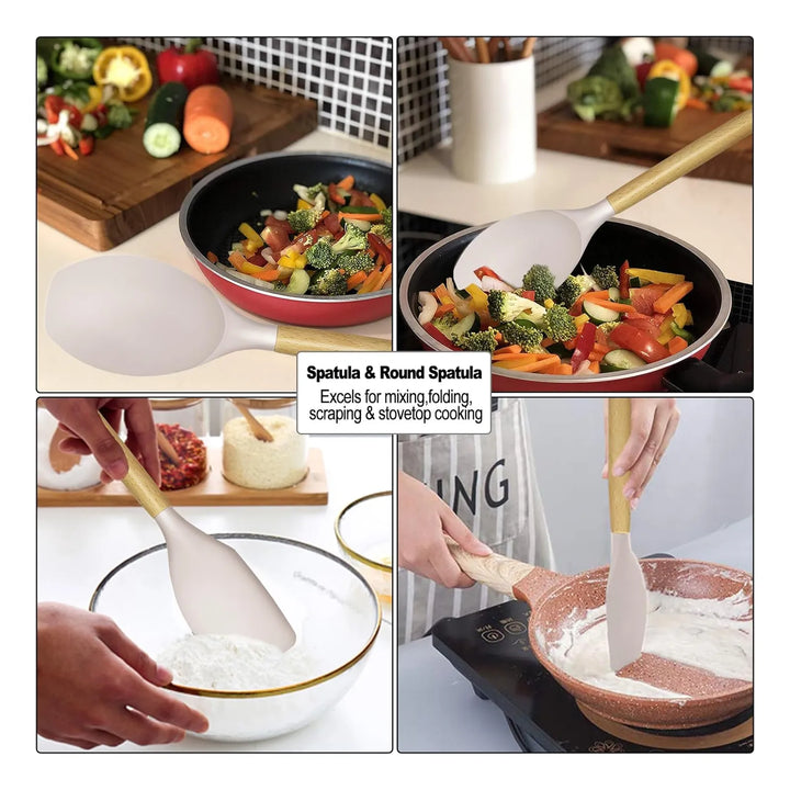 La silicona de grado alimenticio crea una barrera segura entre tus utensilios de cocina y los alimentos, evitando reacciones químicas. Los mangos de madera absorben el calor para que nunca sientas quemaduras, mientras que las cabezas flexibles se adaptan a curvas de ollas para un volteo perfecto.