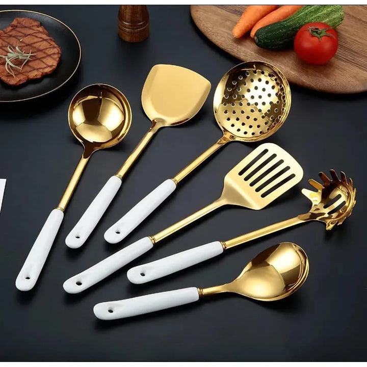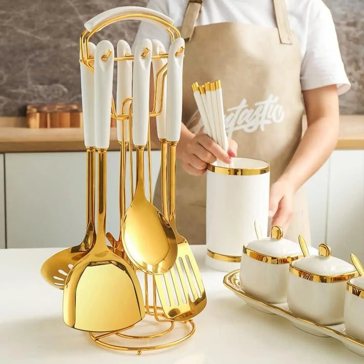 - Materiales premium: acero inoxidable + chapado en oro electrolítico y mangos cerámicos. 💎