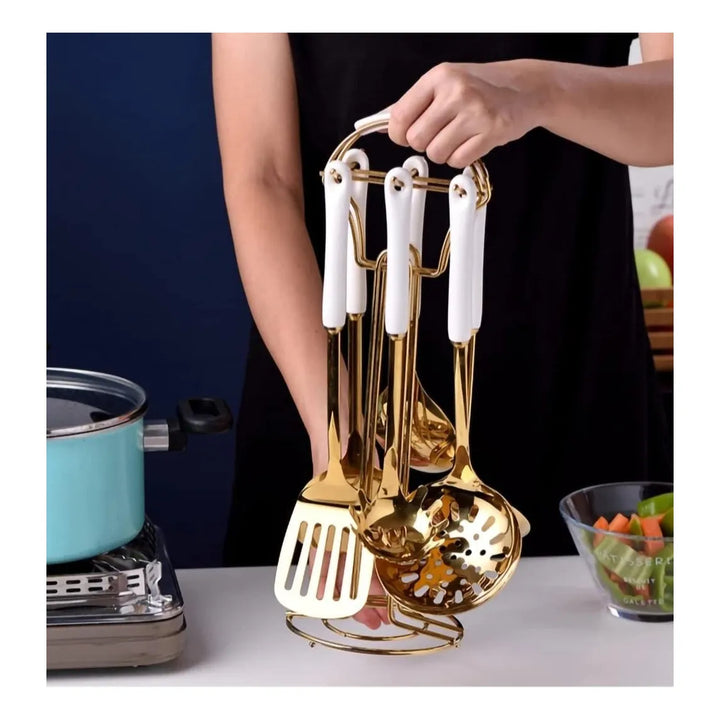 El set incluye 7 piezas esenciales: cuchara ranurada, espátula ranurada, cuchara grande, cucharón de sopa, espátula, cuchara para pasta y un estante colgante integrado. Olvídate del desorden: cada utensilio tiene un orificio para colgar, optimizando espacio y manteniendo todo al alcance de tu mano. Disponible en cuatro tonalidades sofisticadas (oro verde, blanco, azul y negro), se convertirá en el centro de atención de tu cocina.