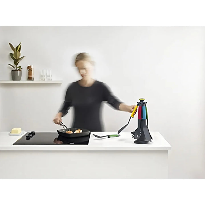El diseño innovador de los mangos ponderados actúa como contrapeso, levantando automáticamente el cabezal del utensilio al dejarlo sobre la encimera. Esto, combinado con la base giratoria, optimiza el flujo de trabajo en la cocina. Para usarlo: 1) Coloca la base en un lugar accesible. 2) Guarda cada utensilio en su compartimento. 3) Gira suavemente para seleccionar la herramienta que necesites. 4) Lava las piezas en lavavajillas (excepto la base, que se limpia con paño húmedo).