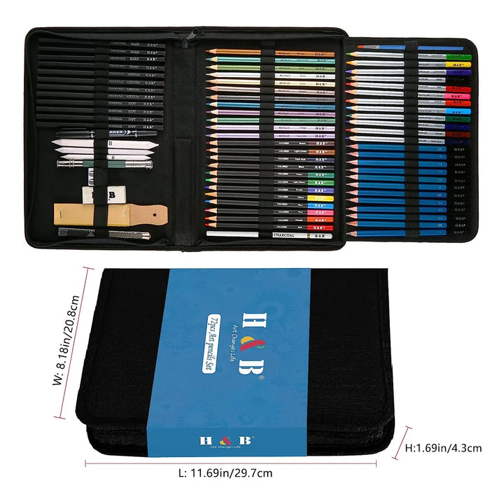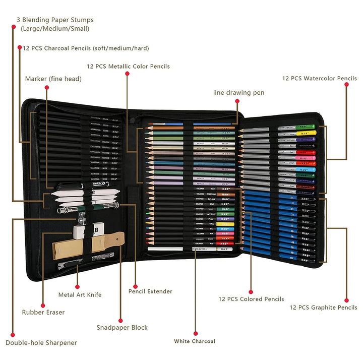 Este juego está diseñado para optimizar tu proceso creativo. Sus lápices de alta adherencia y minas resistentes permiten trazos nítidos sin necesidad de afilar constantemente. El carbón y los metálicos ofrecen contrastes dramáticos, mientras que las acuarelas se activan con agua para efectos pintorescos. El estuche protege tus herramientas y te ayuda a encontrarlas al instante, eliminando el caos de los materiales dispersos.