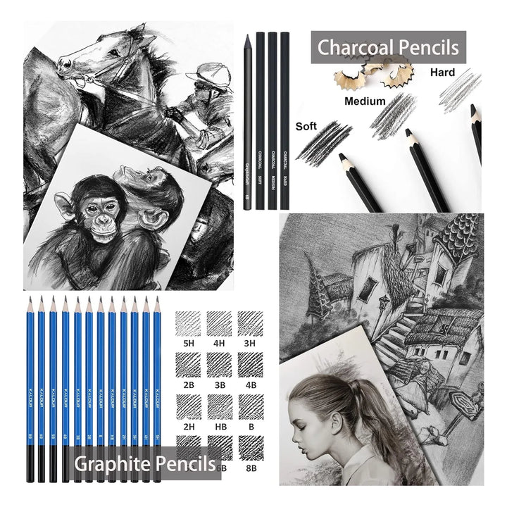 - ✏️ Precisión profesional: Lápices de grafito y carbón que adaptan su intensidad a cada trazo, ideal para detalles o sombreados dramáticos.