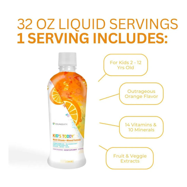 ¿Sabías que el 60% de los niños no consume suficientes vitaminas esenciales? Kids Toddy™ cambia eso. Con su fórmula de naranja irresistible, cada cucharada es un festín de 14 vitaminas, 10 minerales y fitonutrientes que trabajan en equipo para fortalecer su sistema inmunológico, apoyar el desarrollo de huesos fuertes y potenciar su concentración. ¡Y lo mejor? Se absorbe hasta un 30% más rápido que las vitaminas en tabletas!