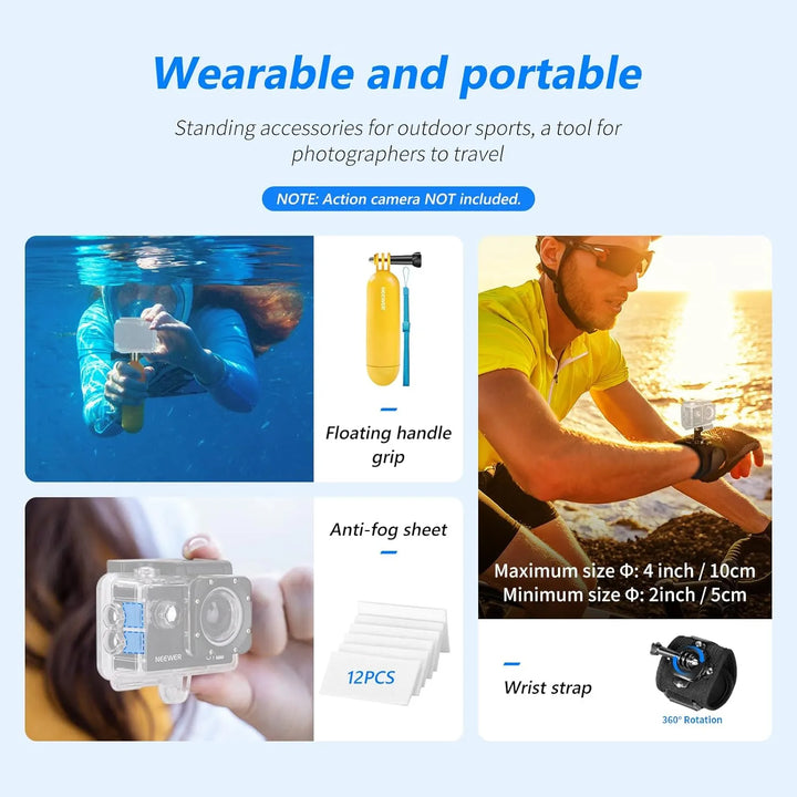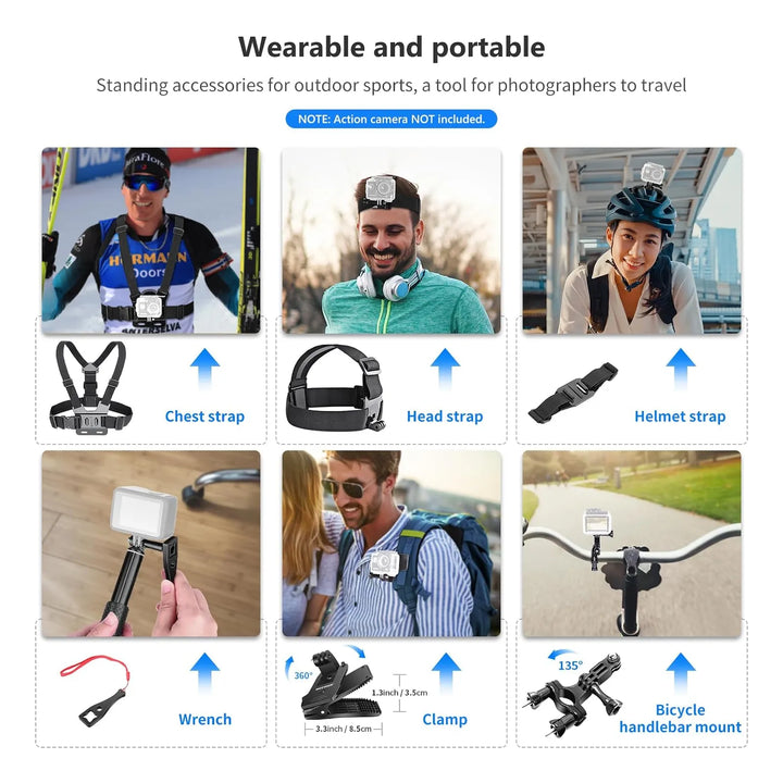 Este kit está diseñado para transformar tu experiencia de grabación. Cada accesorio cumple una función específica: las correas aseguran tu cámara en movimiento, el mango flotante evita accidentes en el agua, y el soporte de manillar te permite grabar mientras conduces. El trípode flexible se adapta a terrenos irregulares, garantizando estabilidad en cualquier situación.