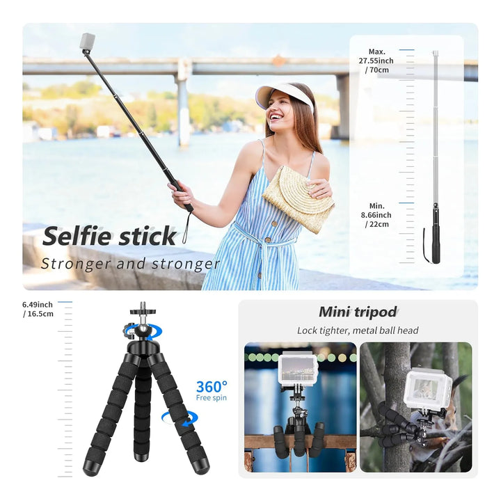 Imagina la sensación de grabar bajo el agua sin miedo a perder tu cámara, o de capturar selfies perfectos con el palo extensible. Este kit no solo es funcional, sino que también está diseñado para durar. Cada pieza ha sido probada para garantizar resistencia y durabilidad, para que puedas enfocarte en lo que realmente importa: vivir la aventura.
