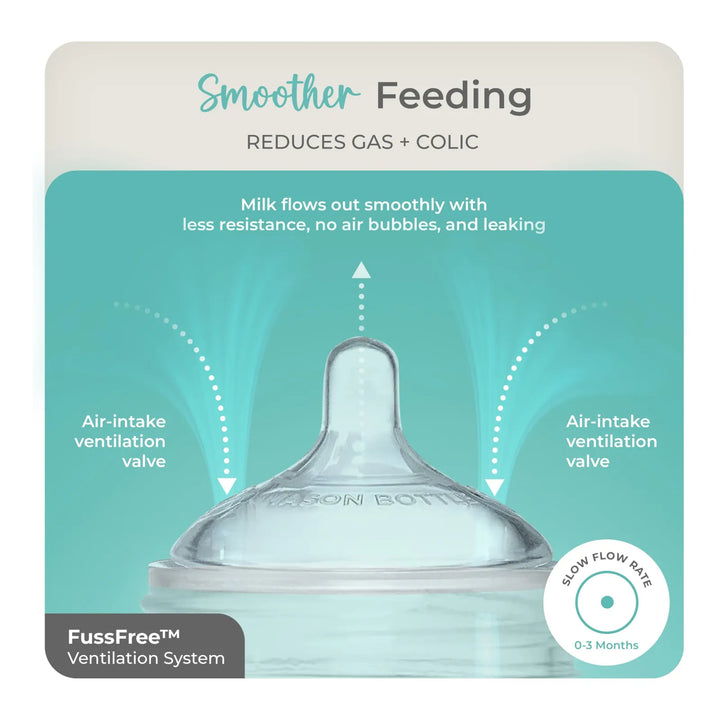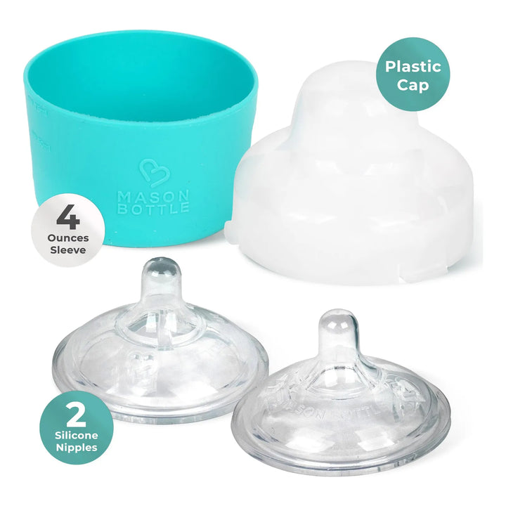 Este kit transforma un tarro Mason común en un biberón funcional y seguro. Simplemente coloca la tetina de silicona en la tapa incluida, ajusta la funda protectora y listo. Su diseño ventilado reduce los cólicos y facilita la alimentación, mientras que la silicona suave imita la sensación natural del pecho materno.