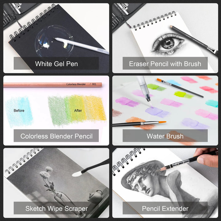 Este producto logra su transformación al ofrecerte herramientas profesionales que eliminan barreras técnicas. Los lápices de carbón y grafito permiten sombreados precisos, mientras que los colores metálicos y las acuarelas añaden profundidad a tus obras. El cuaderno de bocetos, con sus páginas multicolor, te invita a experimentar con contrastes y efectos únicos.
