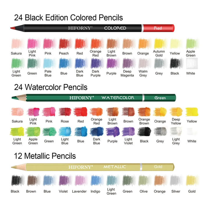 1. Lápices especializados: Desde grafito hasta acuarela, cada uno etiquetado para uso intuitivo ✏️