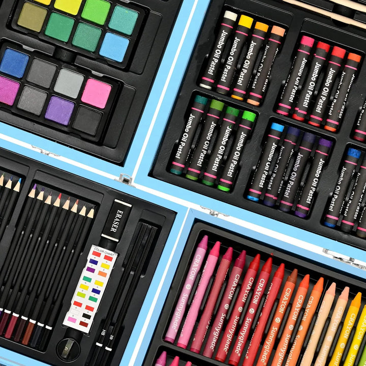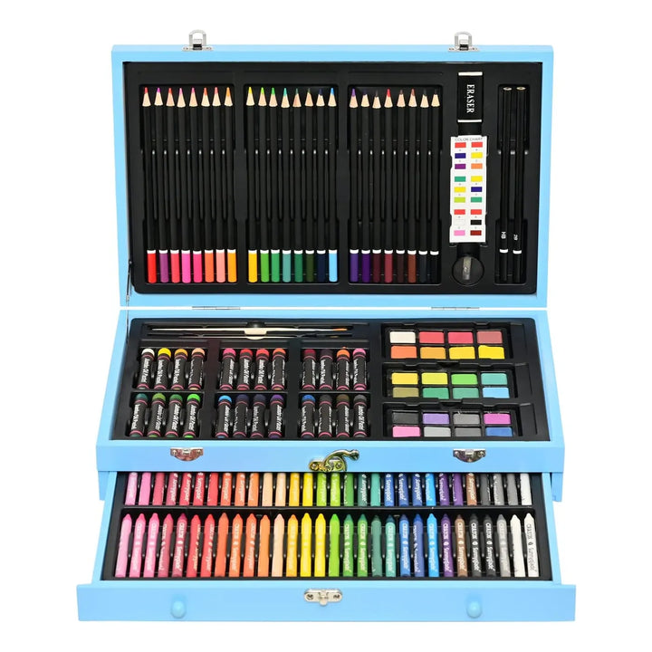 Este kit está diseñado para ofrecerte todo lo que necesitas para comenzar a crear de inmediato. Desde lápices de colores hasta pasteles al óleo, cada herramienta ha sido seleccionada para brindarte versatilidad y calidad en cada trazo. La caja de madera no solo protege tus materiales, sino que también te ayuda a mantener todo organizado, facilitando tu flujo creativo.